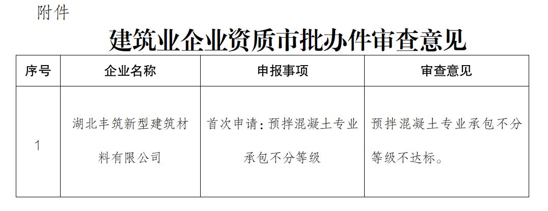 根据《中华人民共和国行政许可法》及《湖北省住房和城乡建设领域“证照分离”改革全覆盖试点工作实施方案》等法律、法规和有关企业资质管理规定,近期我局组织专家对湖北丰筑新型建筑材料有限公司申请的建筑业企业资质进行了审查,现将审查意见予以公示(详见附件)。