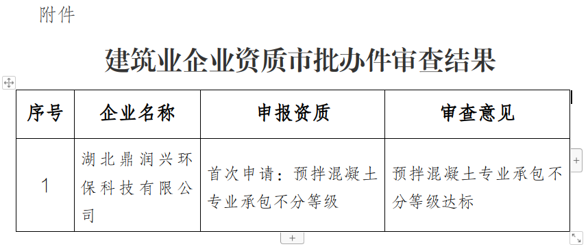 根据《建筑业企业资质标准》《省住建厅关于落实住房城乡建设部进一步加强建设工程企业资质审批管理工作的通知》等有关规定,我局组织专家对湖北鼎润兴环保科技有限公司申请的预拌混凝土专业承包不分等级资质进行了审查,现将审查结果予以公布。
