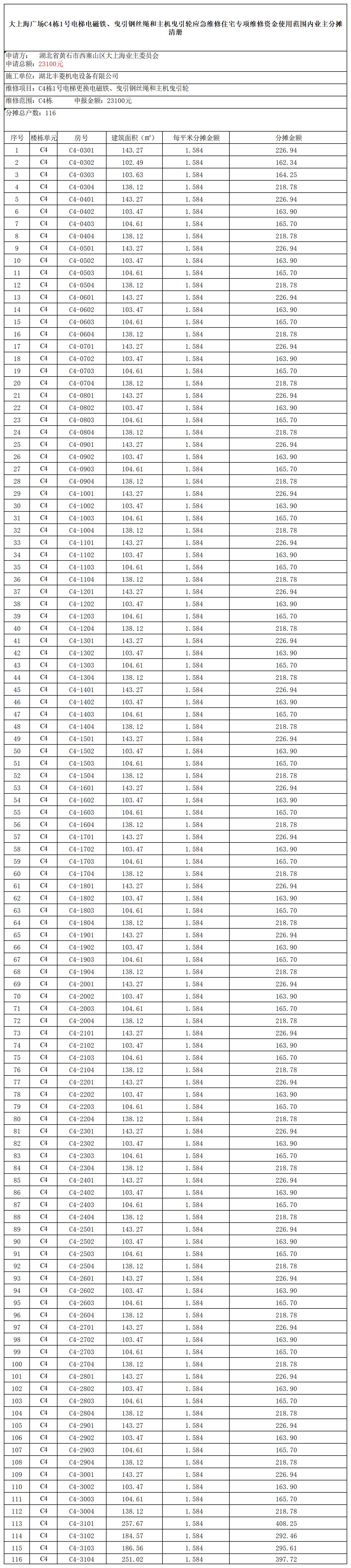大上海广场C4栋1号电梯电磁铁、曳引钢丝绳和主机曳引轮应急维修住宅专项维修资金使用范围内业主分摊清册