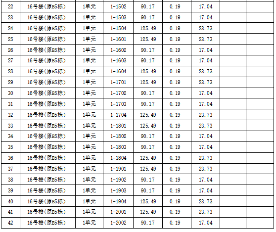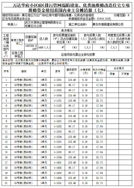 万达华府小区B区排污管网塌陷堵塞、化粪池维修改造住宅专项维修资金使用范围内业主分摊清册(七)