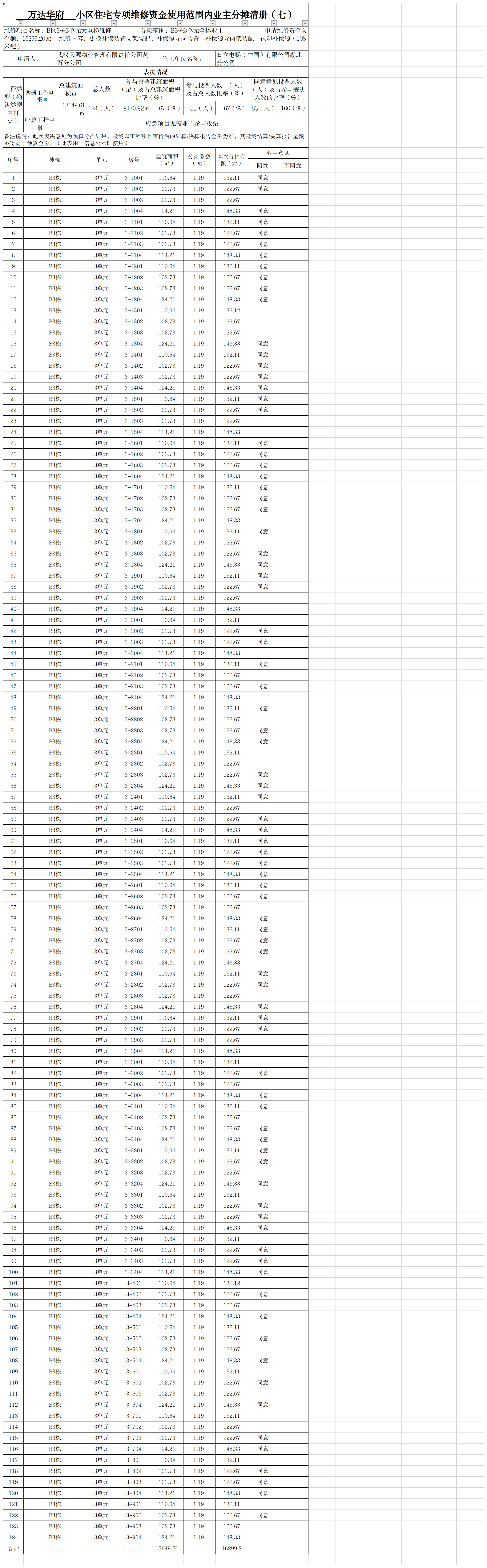 万达华府小区住宅专项维修资金使用范围内业主分摊清册(七)