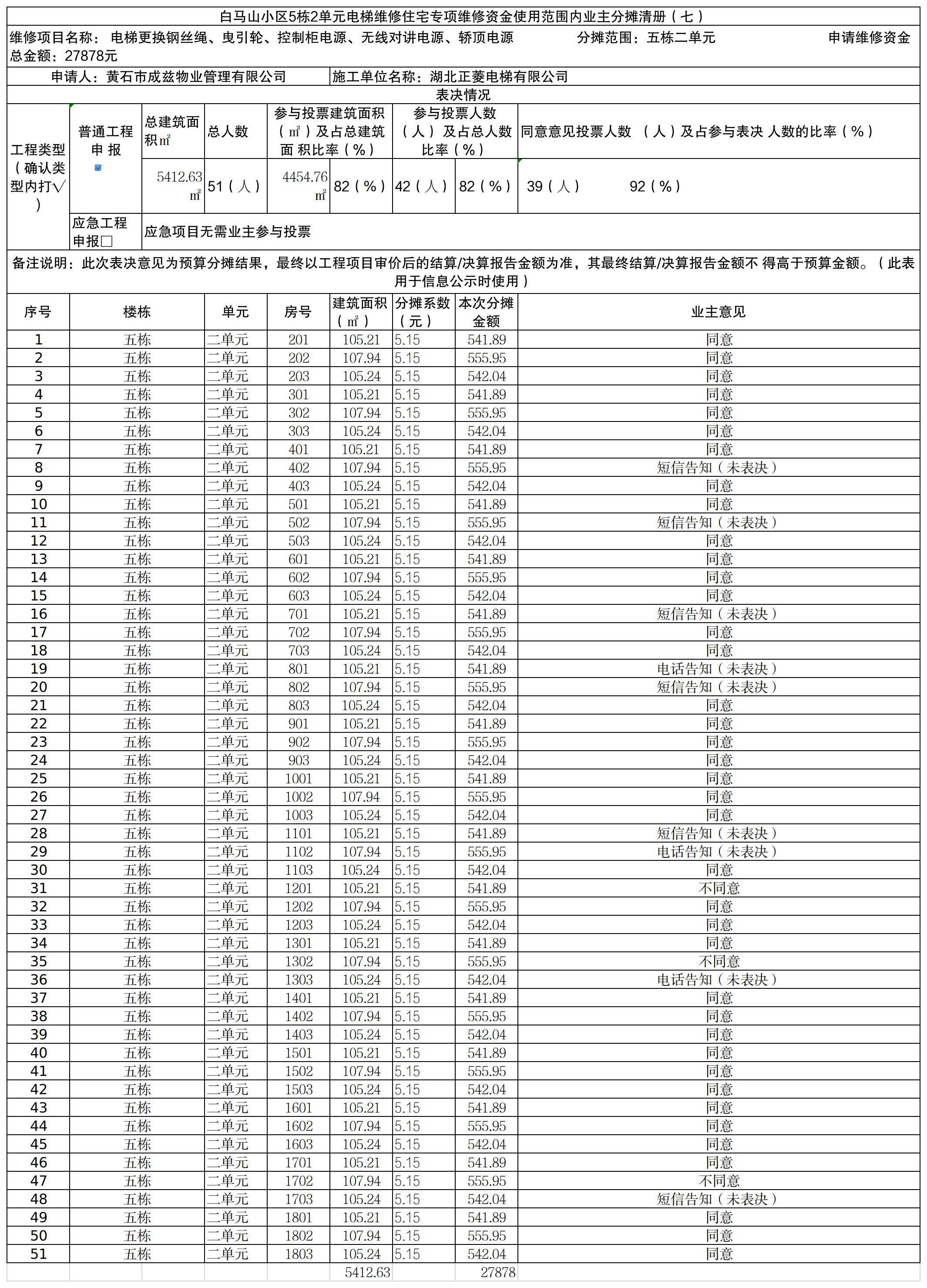 白马山小区5栋2单元电梯维修住宅专项维修资金使用范围内业主分摊清册(七)