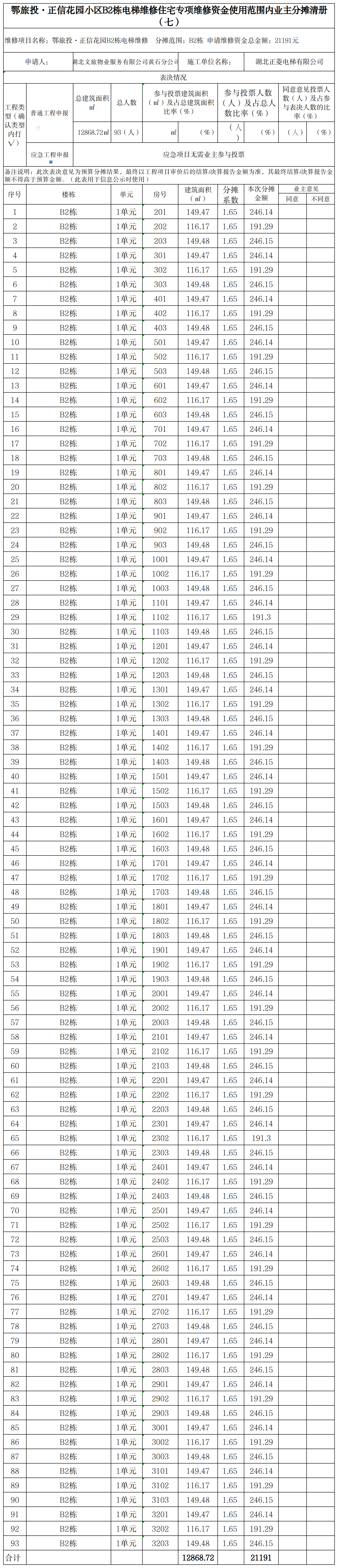 鄂旅投·正信花园小区B2栋电梯维修住宅专项维修资金使用范围内业主分摊清册(七)
