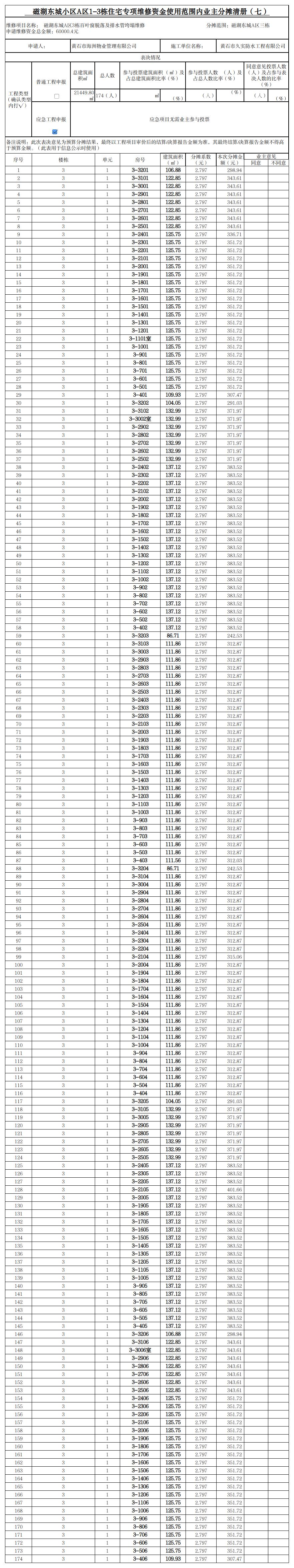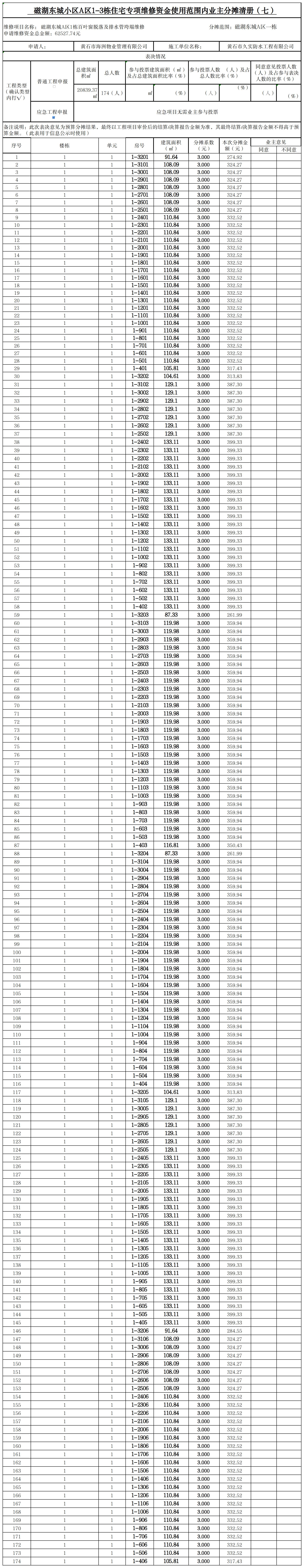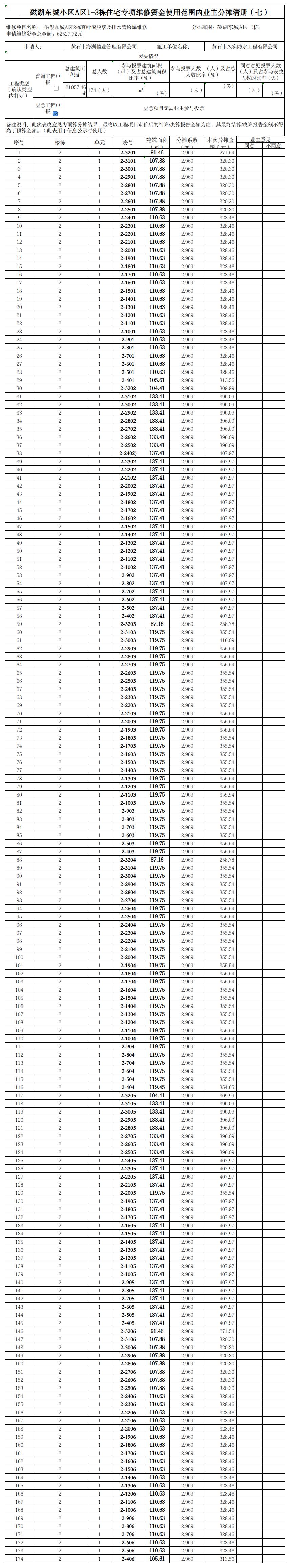 磁湖东城小区A区1-3栋住宅专项维修资金使用范围内业主分摊清册(七)