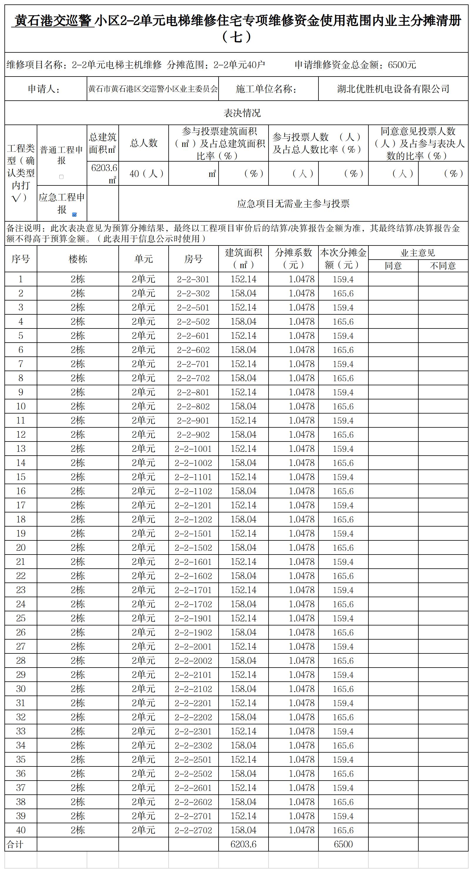 黄石港交巡警小区2-2单元电梯维修住宅专项维修资金使用范围内业主分摊清册(七)
