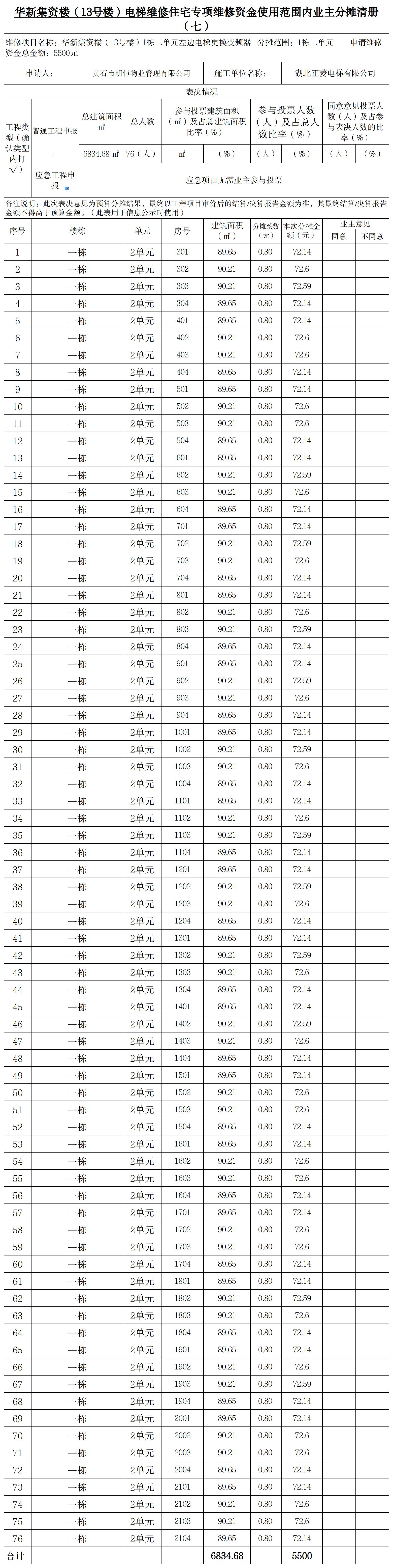 华新集资楼(13号楼)电梯维修住宅专项维修资金使用范围内业主分摊清册