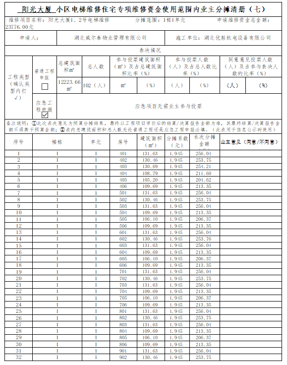 阳光大厦小区电梯维修住宅专项维修资金使用范围内业主分摊清册(七)