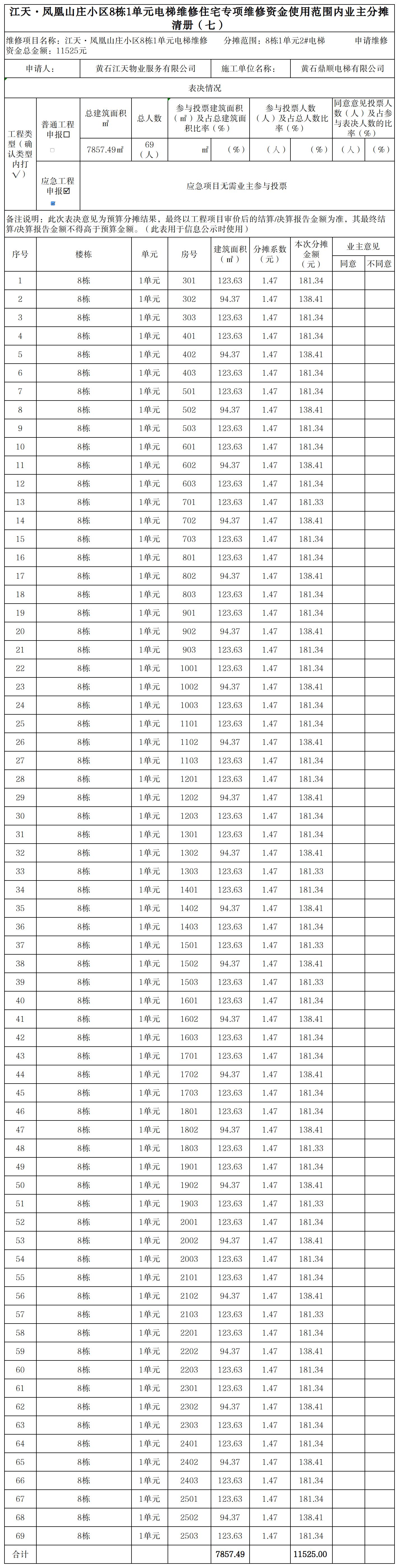 江天·凤凰山庄小区8栋1单元电梯维修住宅专项维修资金使用范围内业主分摊清册(七)
