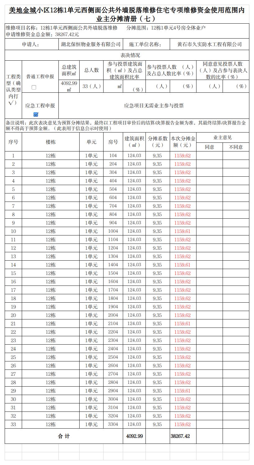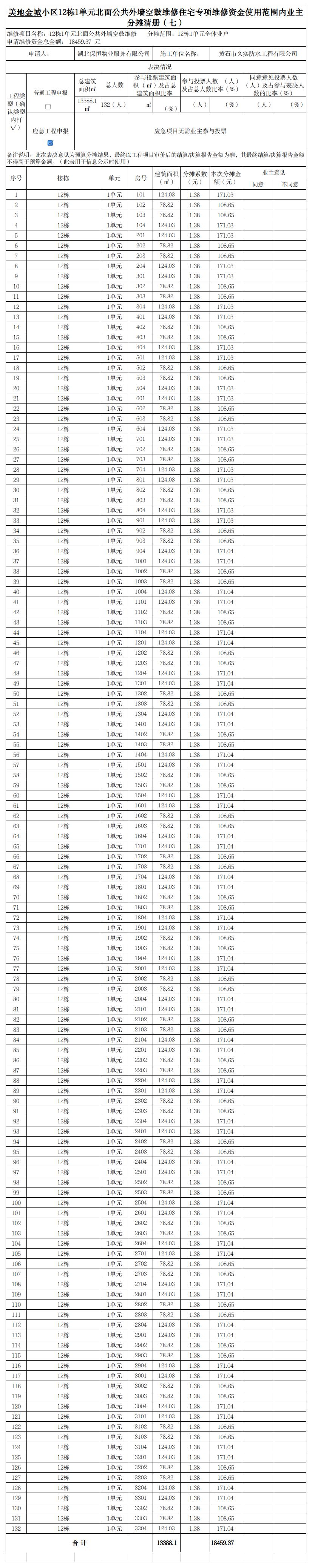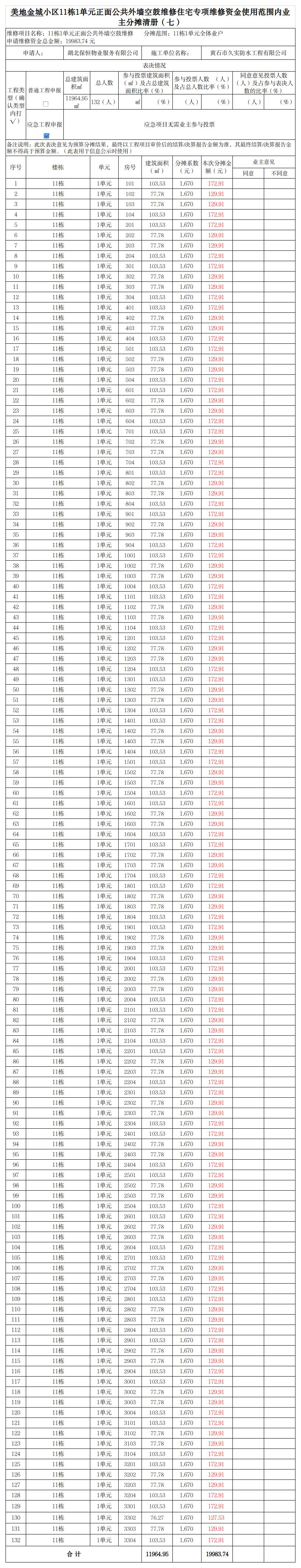美地金城小区11、12栋外墙脱落维修住宅专项维修资金使用范围内业主分摊清册(七)