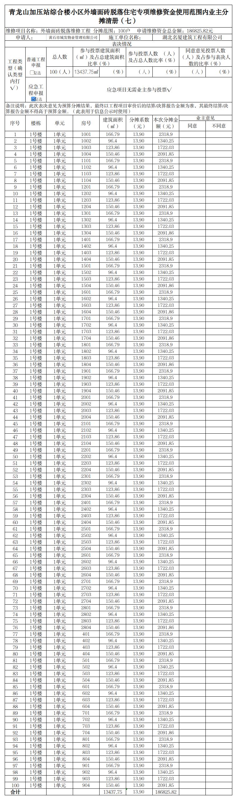 青龙山加压站综合楼小区外墙面砖脱落住宅专项维修资金使用范围内业主分摊清册(七)
