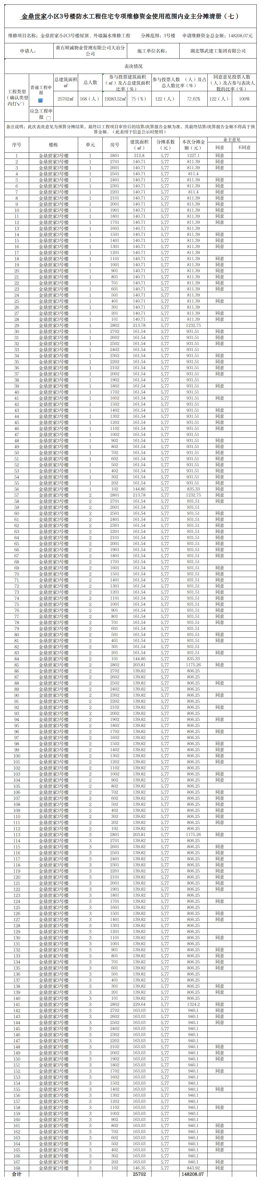 金鼎世家小区3号楼防水工程住宅专项维修资金使用范围内业主分摊清册(七)