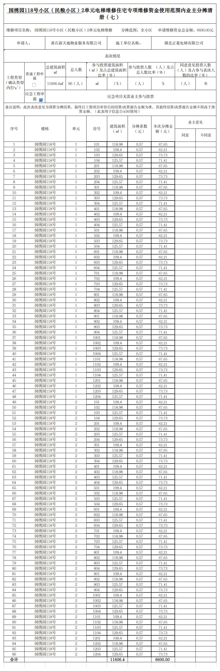国绣园118号小区电梯维修住宅专项维修资金使用范围内业主分摊清册(七)