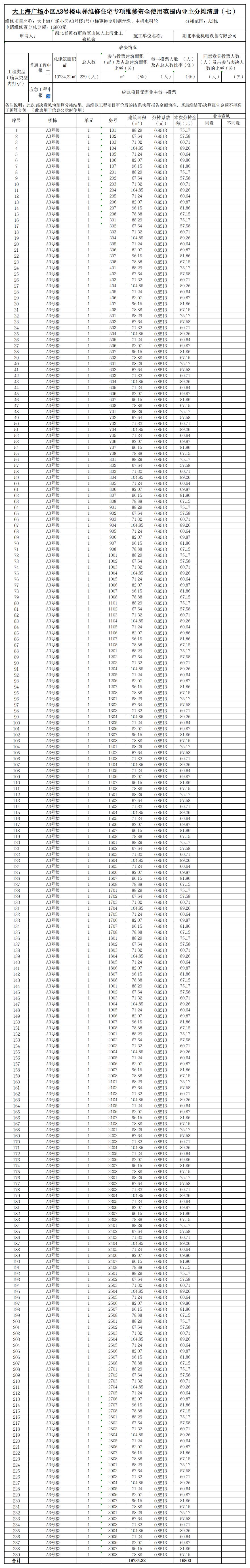 大上海广场小区A3号楼电梯维修住宅专项维修资金使用范围内业主分摊清册(七)