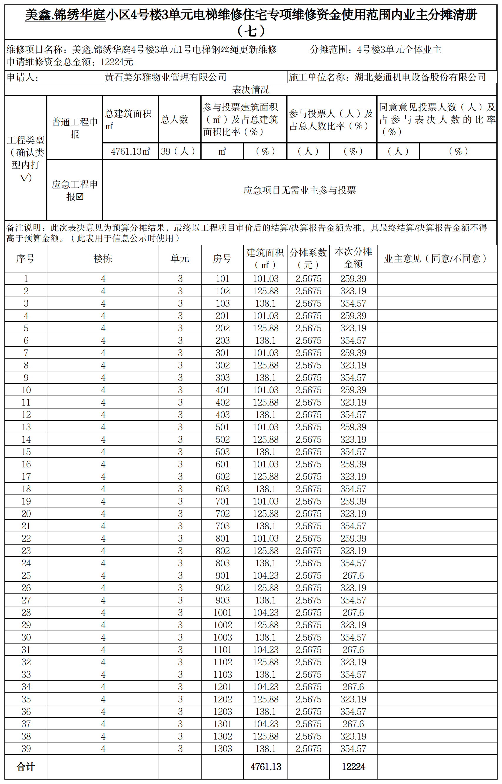 美鑫.锦绣华庭小区4号楼3单元电梯维修住宅专项维修资金使用范围内业主分摊清册(七)