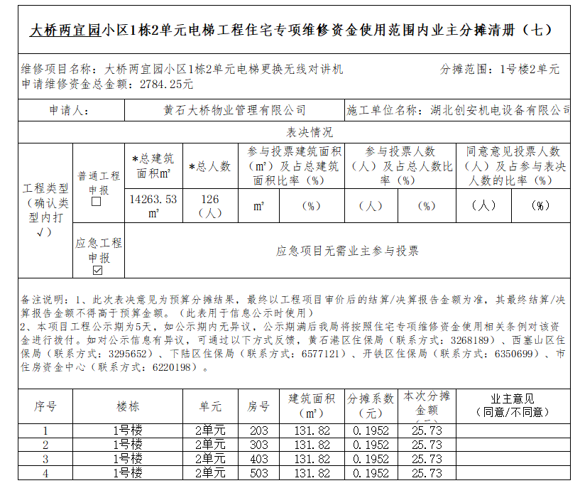 大桥两宜园小区1-2栋1-2单元电梯工程住宅专项维修资金使用范围内业主分摊清册(七)