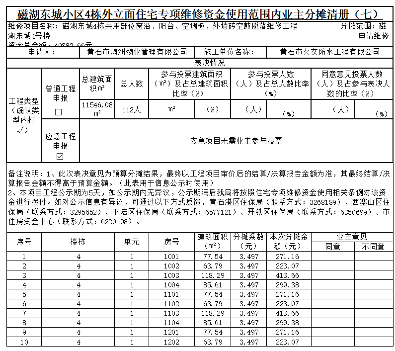 磁湖东城小区4栋外立面住宅专项维修资金使用范围内业主分摊清册(七).xlsx