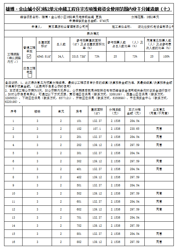 雄博·金山城小区3栋2单元电梯工程住宅专项维修资金使用范围内业主分摊清册(七)