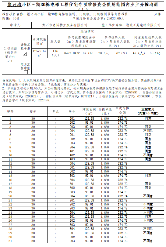 银河湾小区三期30栋电梯工程住宅专项维修资金使用范围内业主分摊清册(七)