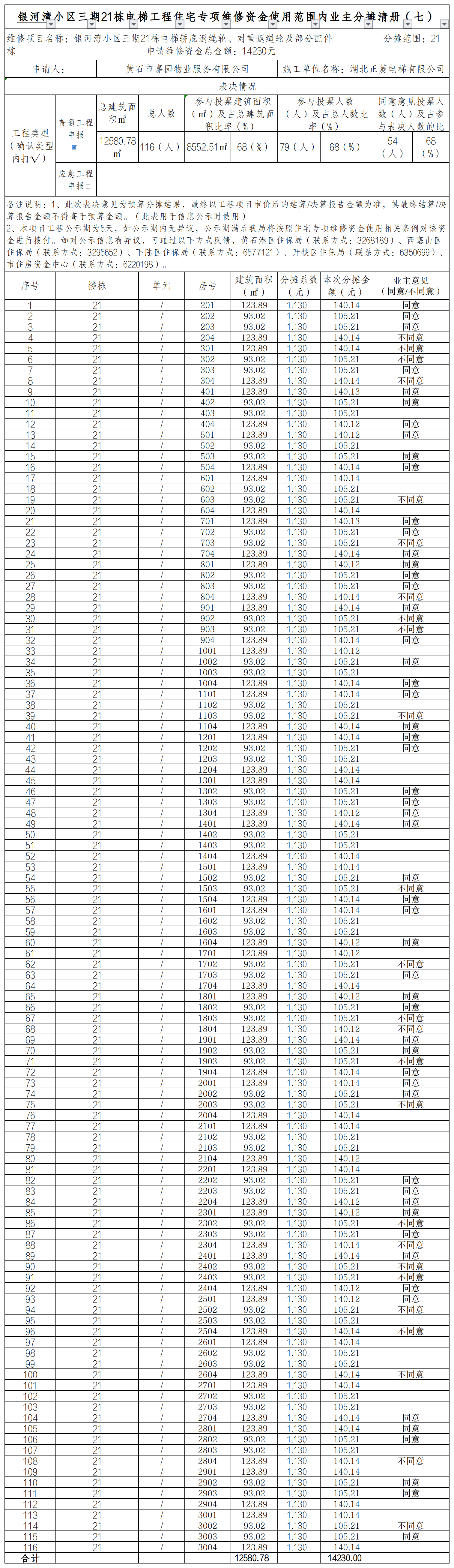 银河湾小区三期21栋电梯工程住宅专项维修资金使用范围内业主分摊清册(七)