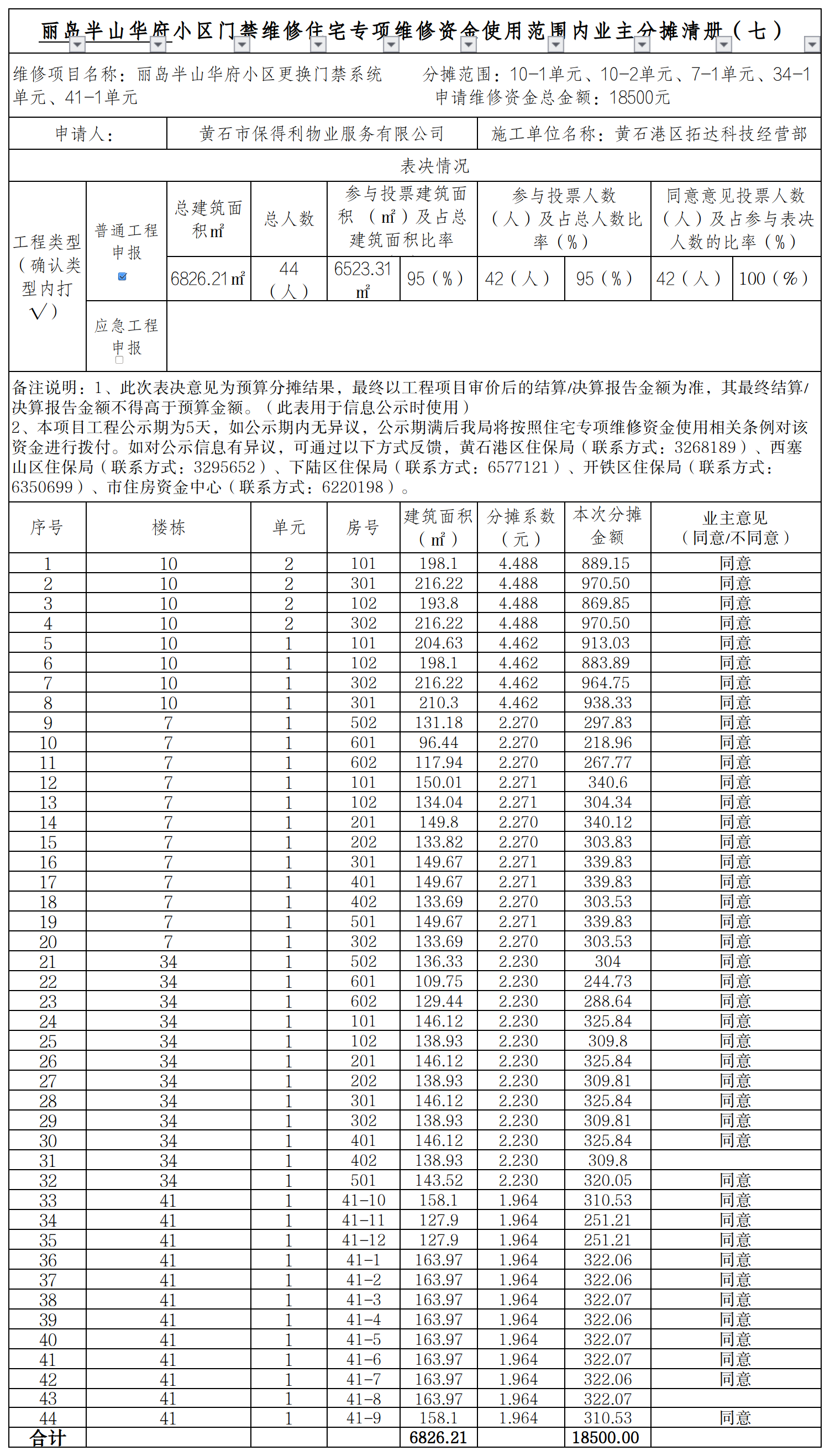 丽岛半山华府小区门禁维修住宅专项维修资金使用范围内业主分摊清册(七)