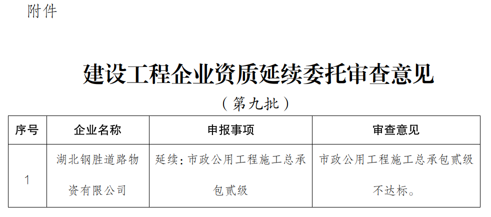 根据省住建厅《关于建设工程企业资质延续有关事项的通知》(厅头〔2023〕2441号)《建筑业企业资质标准》等有关规定,近期我局组织专家对湖北钢胜道路物资有限公司申请的建筑业企业资质延续进行了审查,现将委托审查意见予以公示(见附件)。