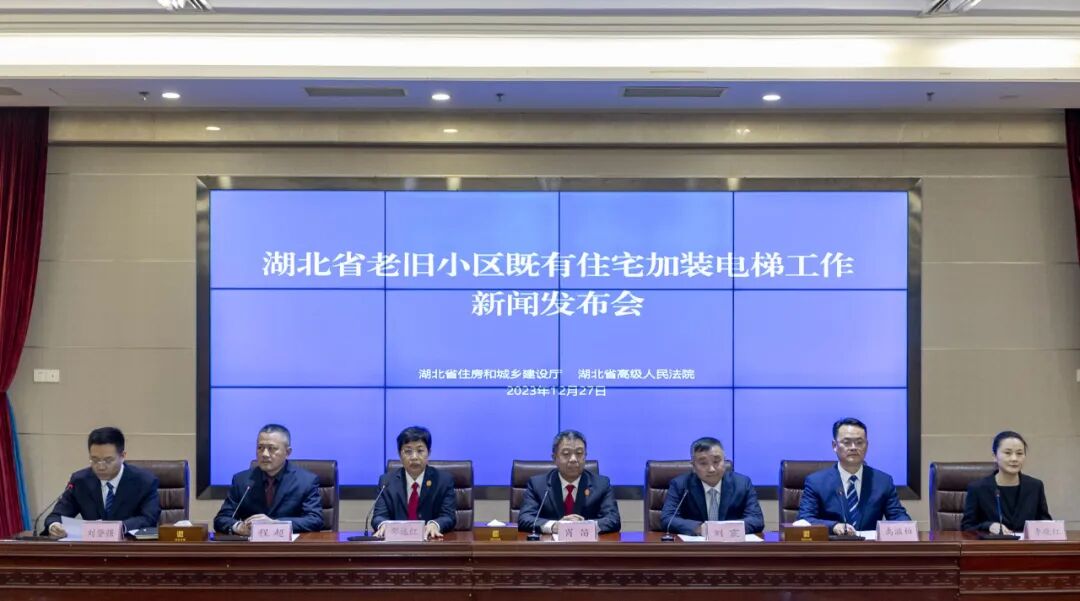 12月27日,湖北省住房和城乡建设厅、湖北省高级人民法院联合召开老旧小区既有住宅加装电梯工作新闻发布会。省高级人民法院党组成员、副院长肖笛,省住建厅党组成员、副厅长刘震,省高级人民法院民一庭庭长邵远红,省住建厅城建处处长禹滋柏,黄石市住建局副局长程超,宜昌市宜加梯电梯加装服务中心秘书长李晓红出席新闻发布会并回答记者提问,省住建厅办公室主任刘登强主持新闻发布会。