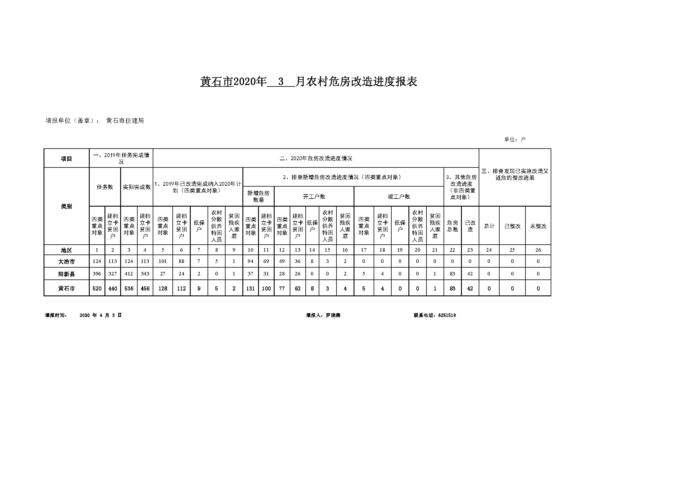 黄石市2020年3月危房改造进度报表