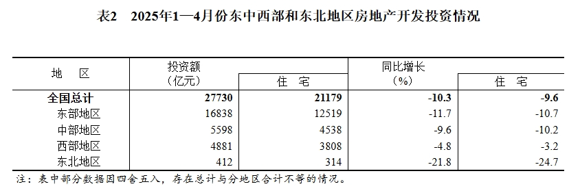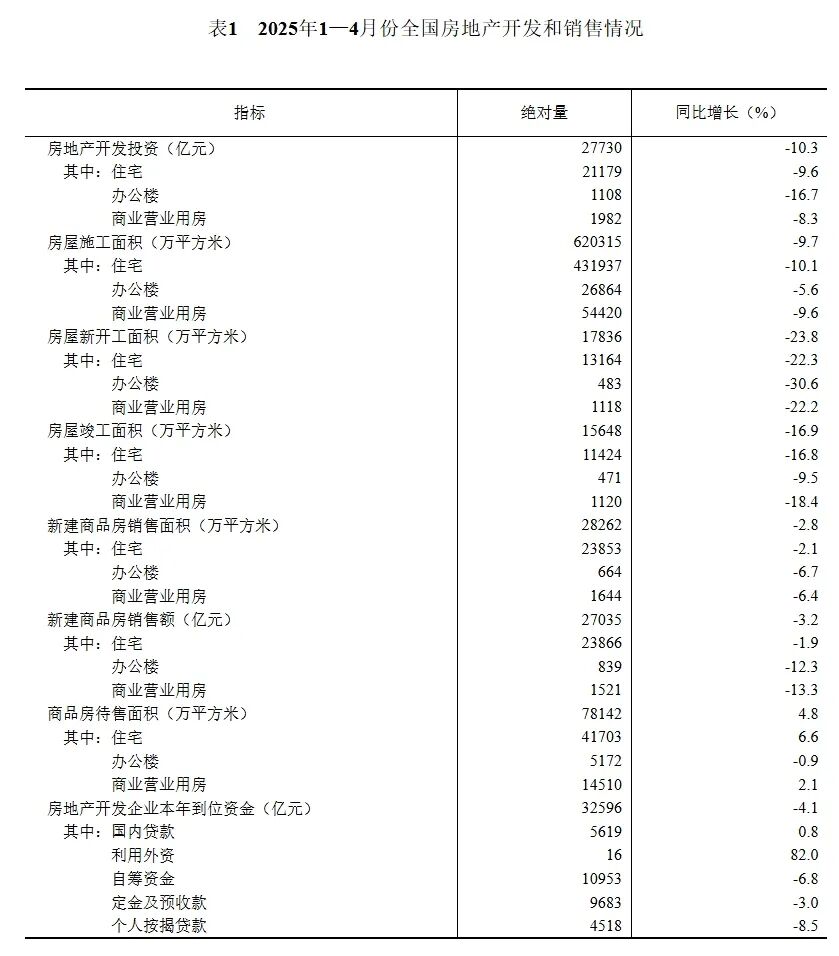 1—4月份,全国房地产开发投资27730亿元,同比下降10.3%(按可比口径计算,详见附注6);其中,住宅投资21179亿元,下降9.6%。