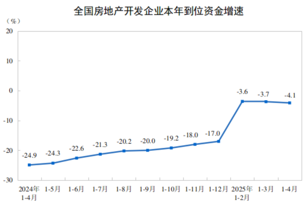 1—4月份,房地产开发企业房屋施工面积620315万平方米,同比下降9.7%。其中,住宅施工面积431937万平方米,下降10.1%。房屋新开工面积17836万平方米,下降23.8%。其中,住宅新开工面积13164万平方米,下降22.3%。房屋竣工面积15648万平方米,下降16.9%。其中,住宅竣工面积11424万平方米,下降16.8%。