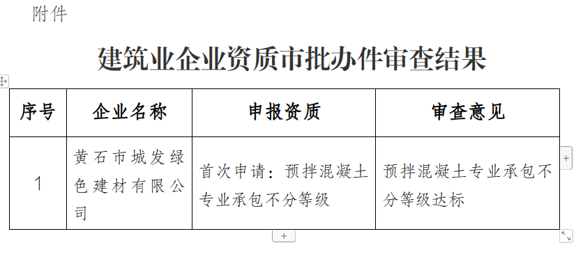 根据《建筑业企业资质标准》《省住建厅关于落实住房城乡建设部进一步加强建设工程企业资质审批管理工作的通知》等有关规定,我局组织专家对黄石市城发绿色建材有限公司申请的预拌混凝土专业承包不分等级资质进行了审查,现将审查结果予以公布。