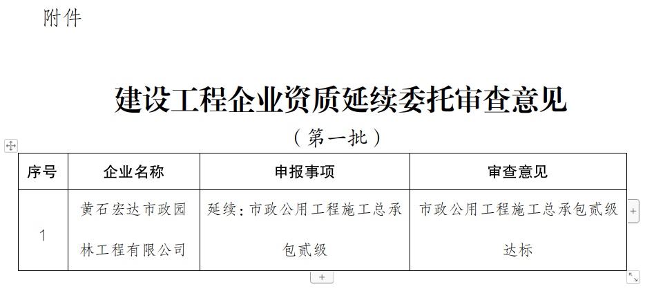 根据省住建厅《关于建设工程企业资质延续有关事项的通知》(厅头〔2023〕2441号)《建筑业企业资质标准》等有关规定,近期我局组织专家对黄石宏达市政园林工程有限公司申请的建筑业企业资质延续进行了审查,现将委托审查意见予以公示(见附件)。