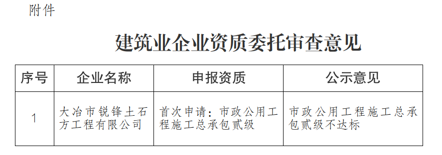 根据《建筑业企业资质标准》《省住建厅关于落实住房城乡建设部进一步加强建设工程企业资质审批管理工作的通知》等有关规定,我局组织专家对大冶市锐锋土石方工程有限公司申请的建筑业企业贰级资质进行了审查,现将委托审查意见予以公示。