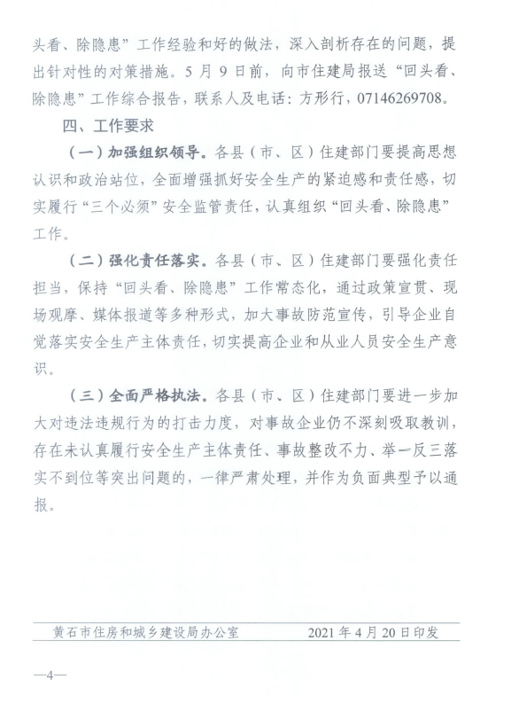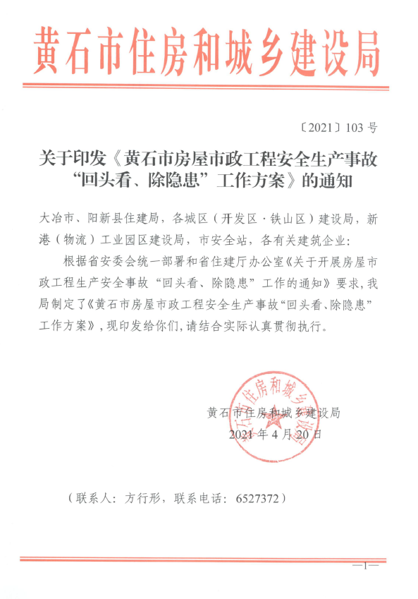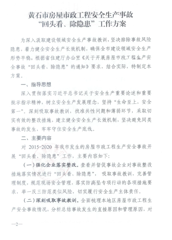 关于印发《黄石市房屋市政工程安全生产事故“回头看、除隐患”工作方案》的通知