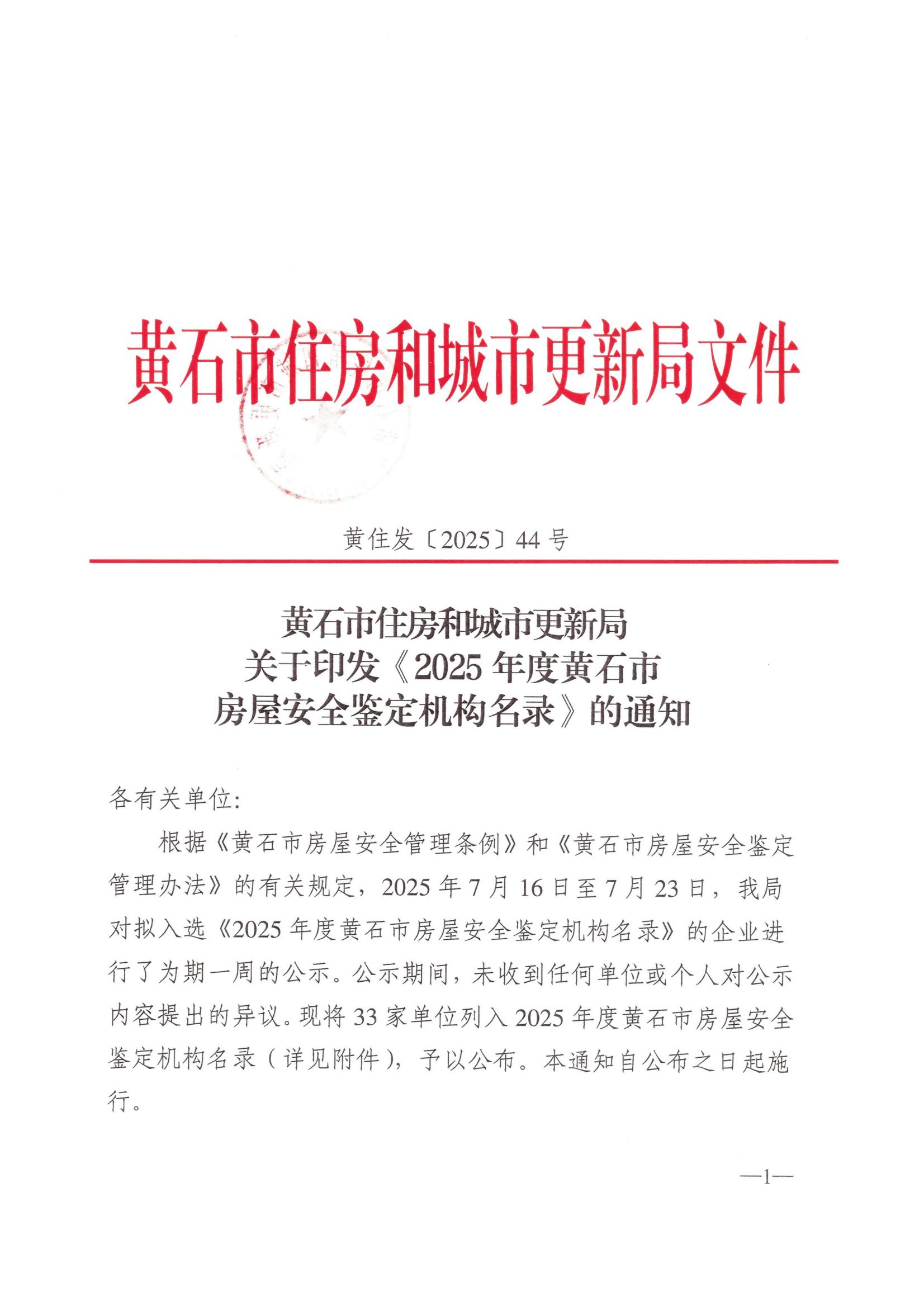 关于印发《2025年度黄石市房屋安全鉴定机构名录》的通知