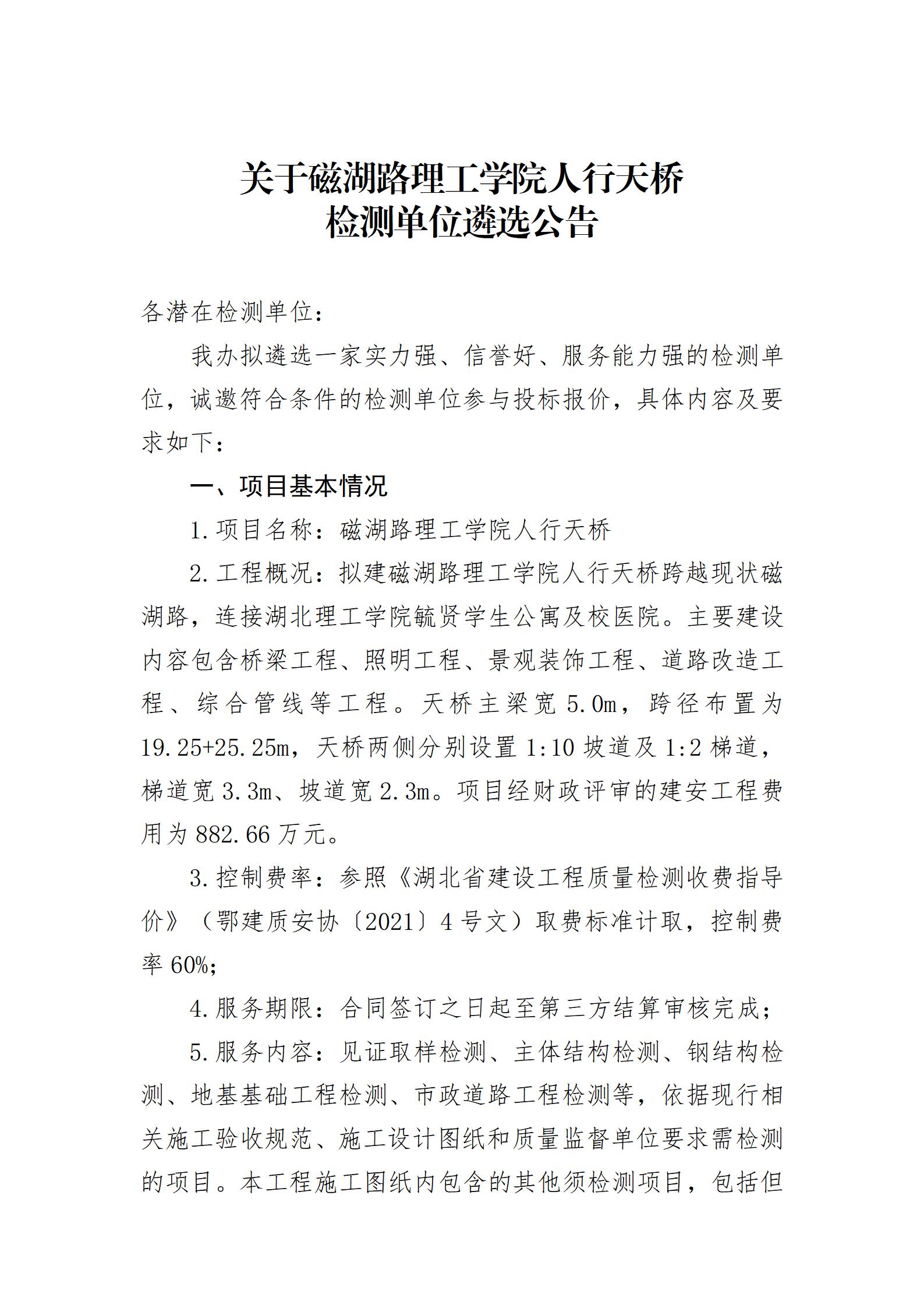 关于磁湖路理工学院人行天桥检测单位遴选公告