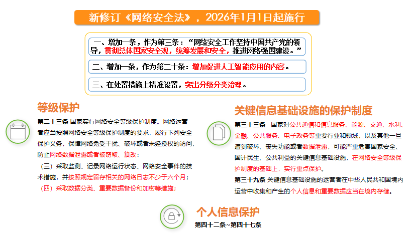新修订的《中华人民共和国网络安全法》(以下简称:“《网络安全法》”),已由中华人民共和国第十四届全国人民代表大会常务委员会第十八次会议于2025年10月28日通过,自2026年1月1日起施行。