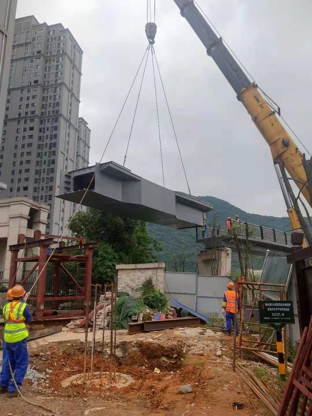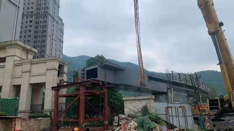 2021年5月17日下午13点58分,由市住建局(建管办)负责实施的广州路景观桥连接线工程桥梁工程主体钢箱梁第三跨开始吊装,该景观人行天桥设计为钢箱梁连续梁人行天桥,主桥总长98m,钢箱梁跨径为27.5m+40m+30.5m,主桥宽3.5m,主体钢箱梁重量约为226吨,第三跨钢箱梁重量为84.5吨。吊装全过程安全合理,工序到位,交通疏导有序,严格按既定吊装方案实。至18点02分,经过4个小时吊装作业,第三跨钢箱梁顺利完成吊装。其余2跨钢箱梁吊装将陆续进行。市建管办将克服该地段车多人多的问题,科学组织、精细施工,整个景观人行天桥主体结构钢箱梁计划于5月21日全部吊装完成,25日完成全部焊接及涂装。