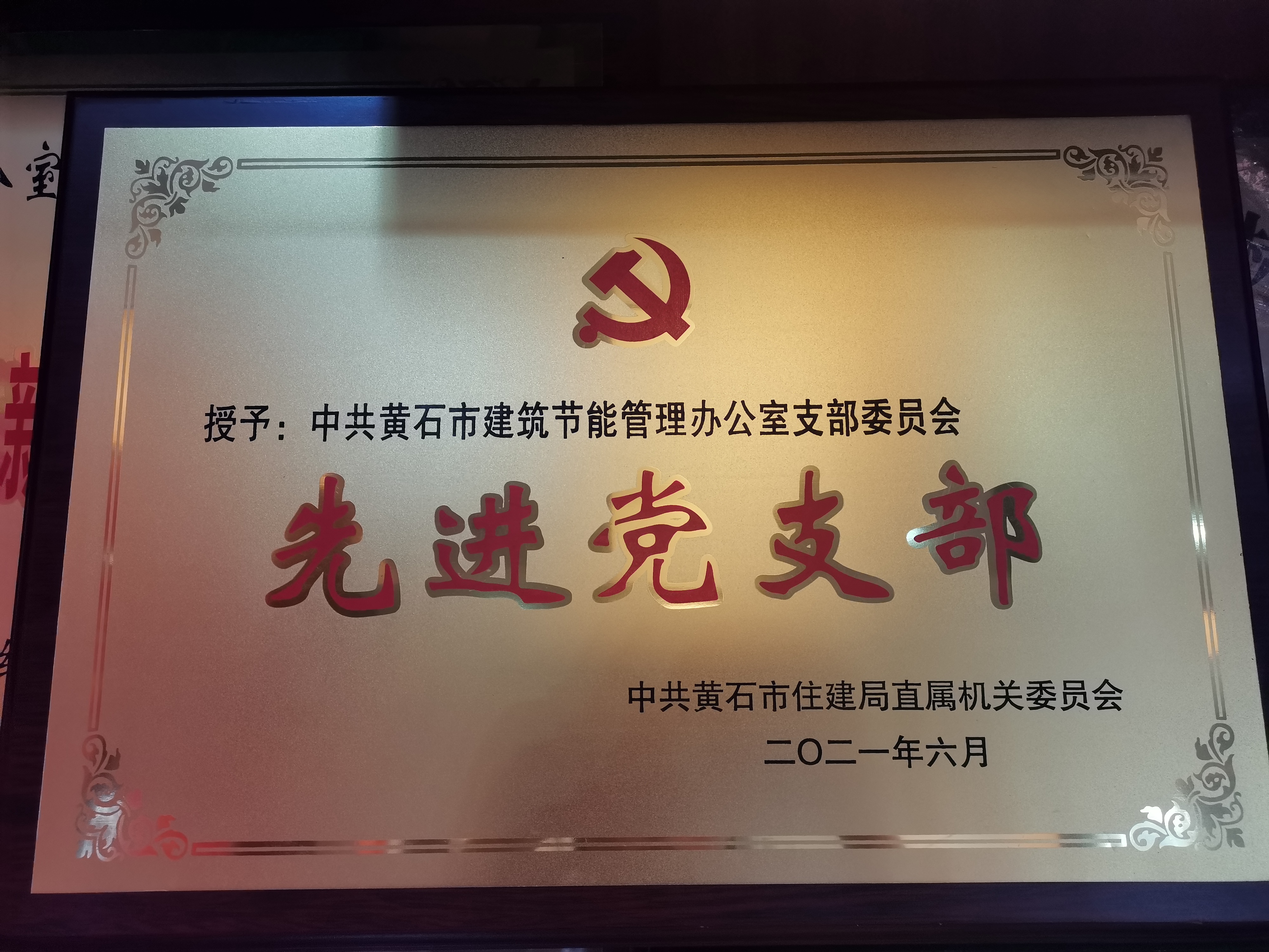 2021年6月18日下午,在市住建局“永远跟党走”庆祝建党100周年主题宣传教育活动现场,市建筑节能办党支部获得2021年度“先进党支部”的荣誉称号。