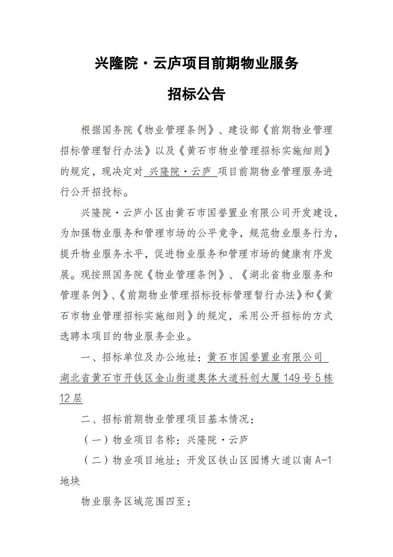 兴隆院 ▪ 云庐项目前期物业服务招标公告
