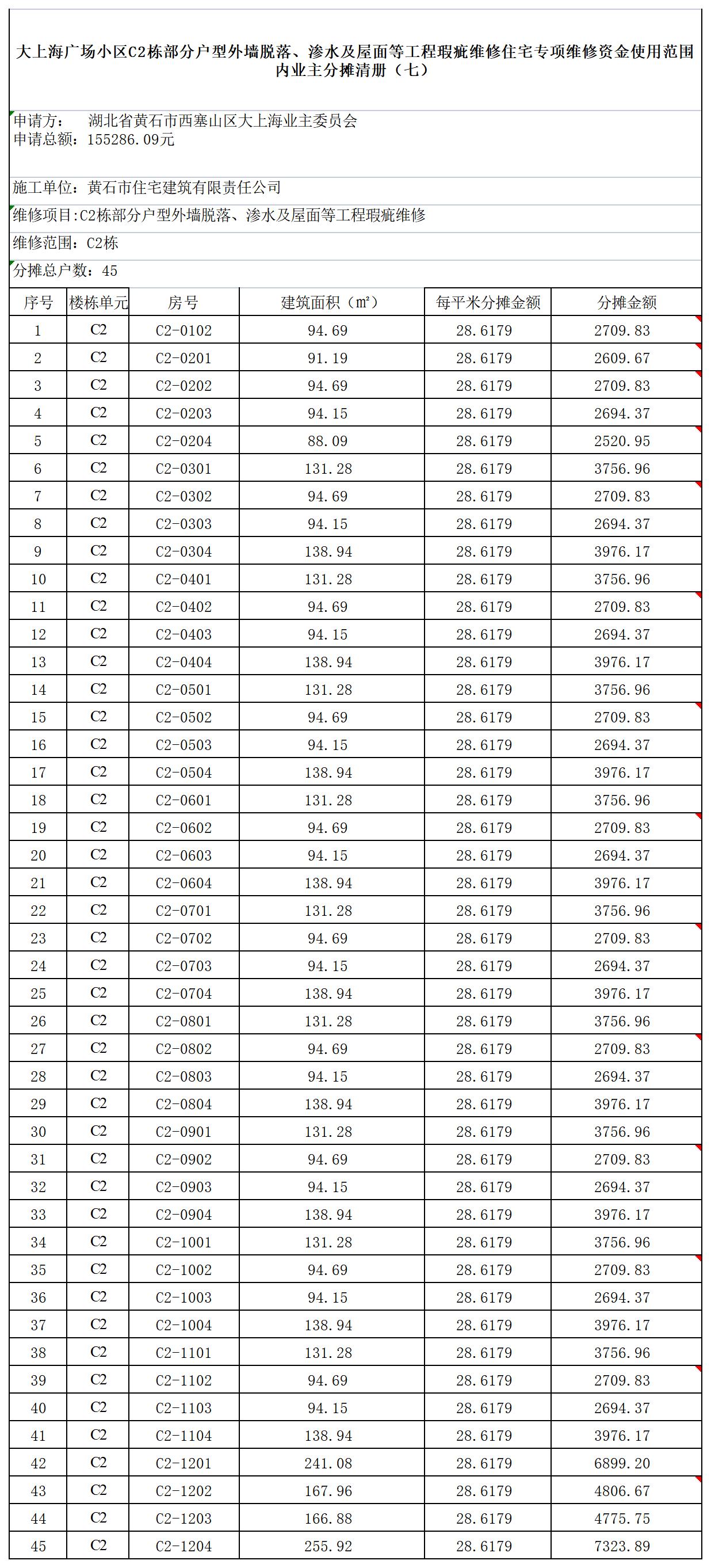 大上海广场C2栋外墙脱落应急维修住宅专项维修资金使用范围内业主分摊清册