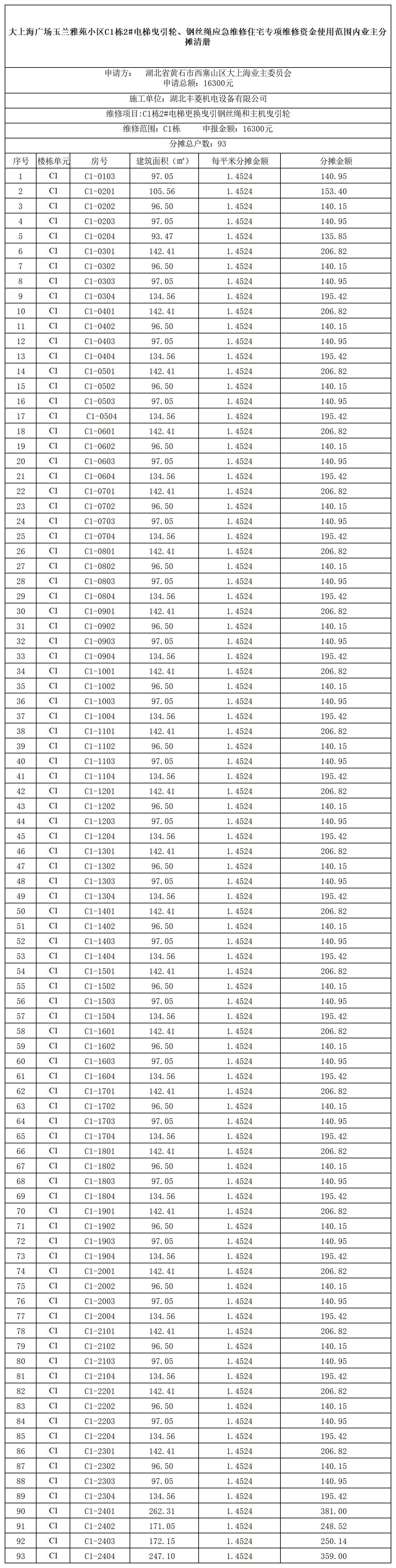 大上海广场玉兰雅苑小区C1栋2#电梯曳引轮、钢丝绳应急维修住宅专项维修资金使用范围内业主分摊清册
