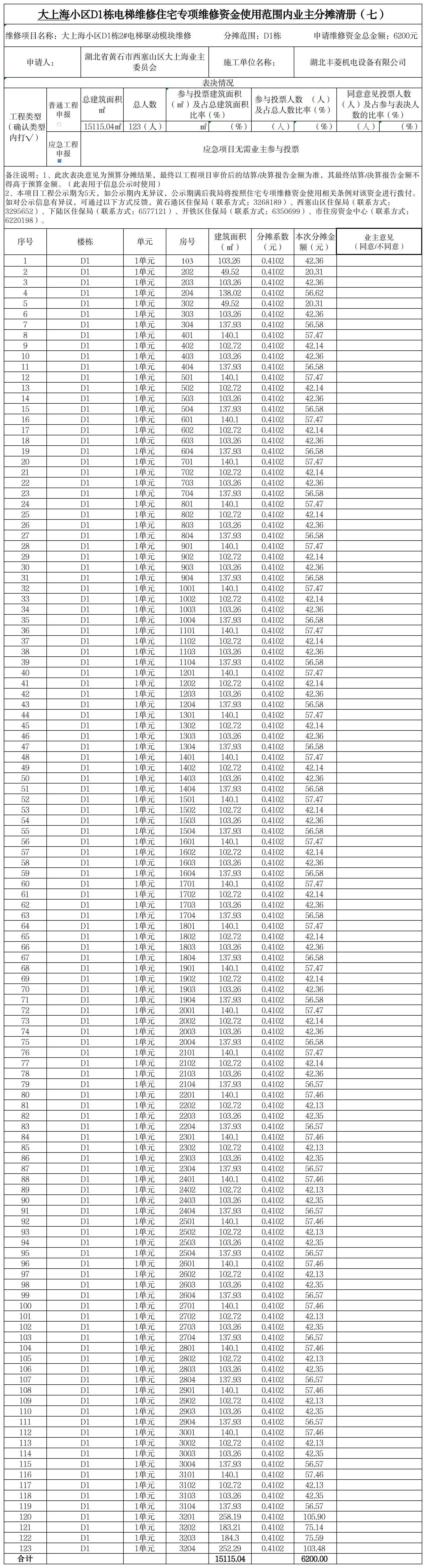 大上海小区D1栋电梯维修住宅专项维修资金使用范围内业主分摊清册(七)