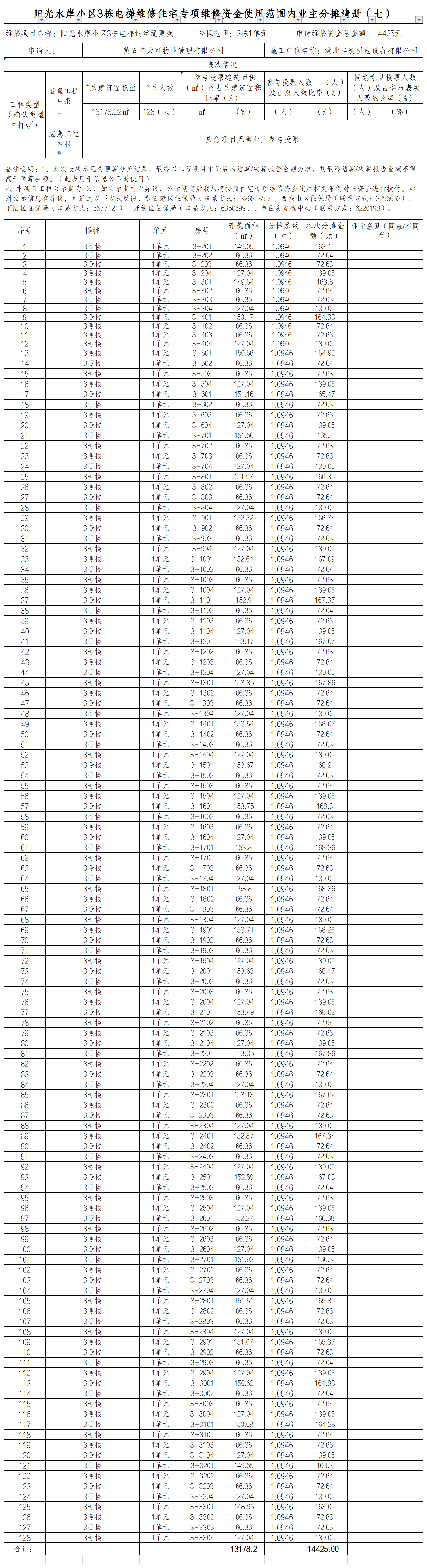 阳光水岸小区3栋电梯维修住宅专项维修资金使用范围内业主分摊清册(七)