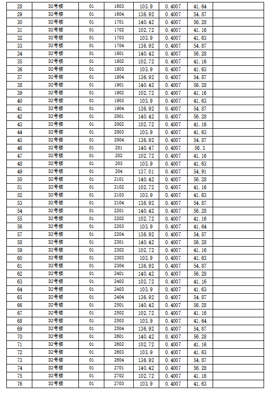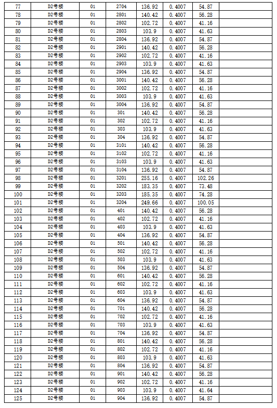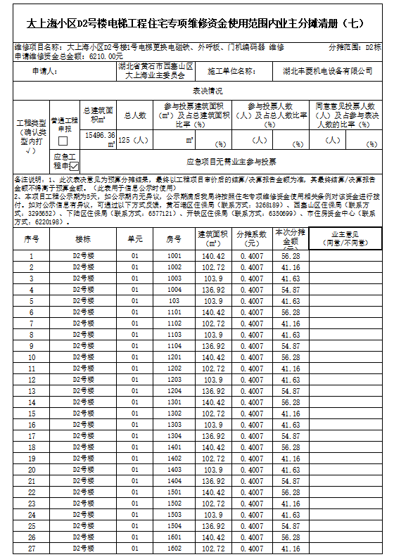 大上海小区D2号楼电梯工程住宅专项维修资金使用范围内业主分摊清册