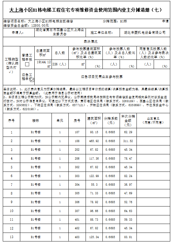 大上海小区B1栋电梯工程住宅专项维修资金使用范围内业主分摊清册