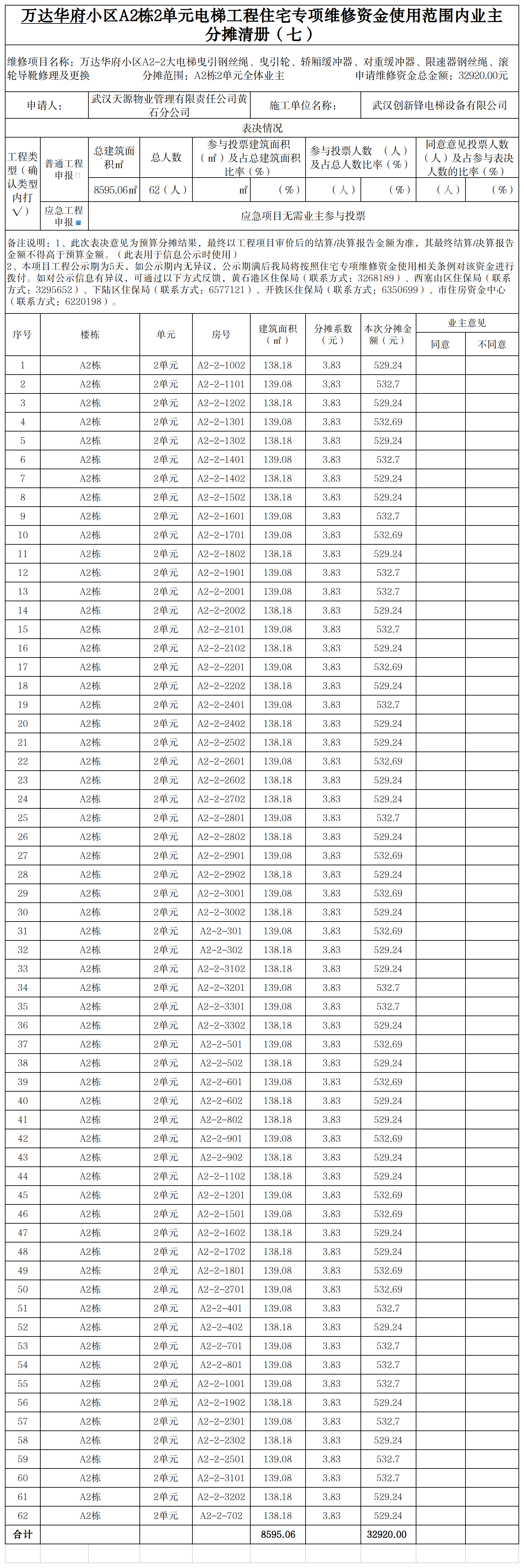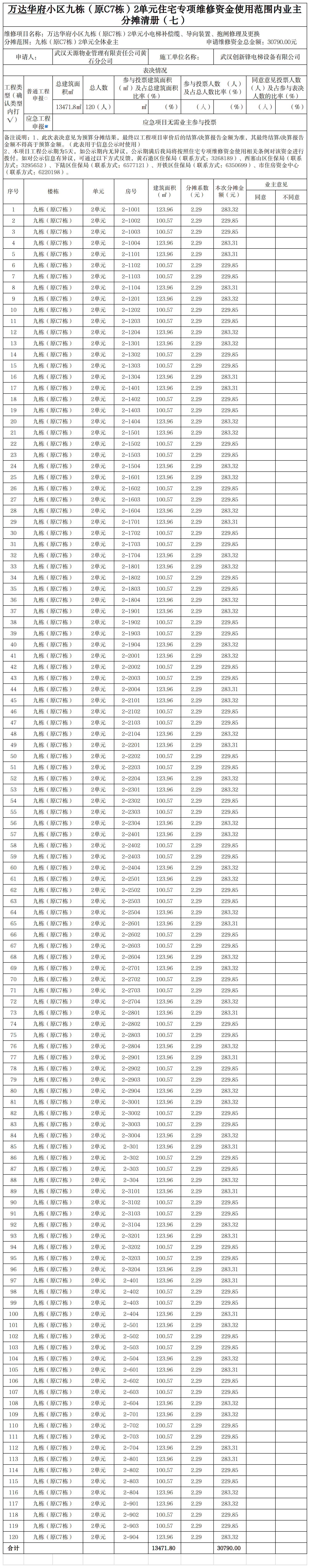 万达华府小区A2栋2单元、A3栋2单元、9栋(原C7栋)2单元电梯工程住宅专项维修资金使用范围内业主分摊清册(七)
