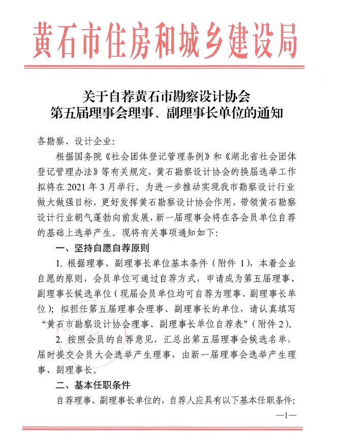 关于自荐黄石市勘察设计协会第五届理事会理事、副理事长单位的通知