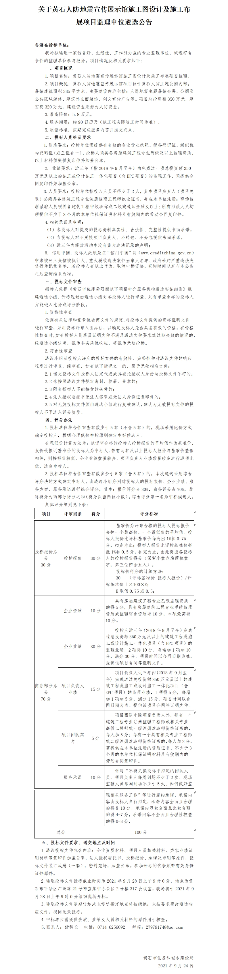 关于黄石人防地震宣传展示馆施工图设计及施工布展项目监理单位遴选公告