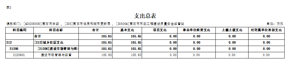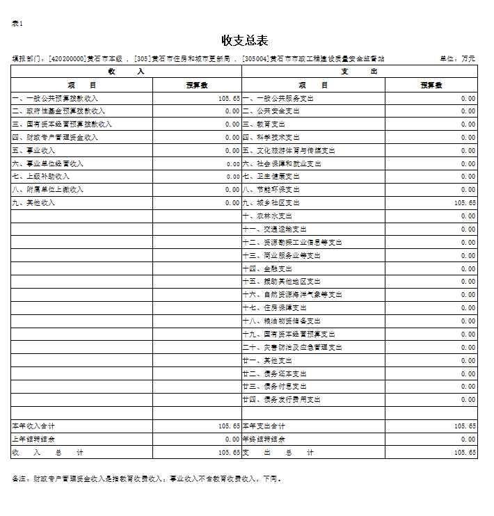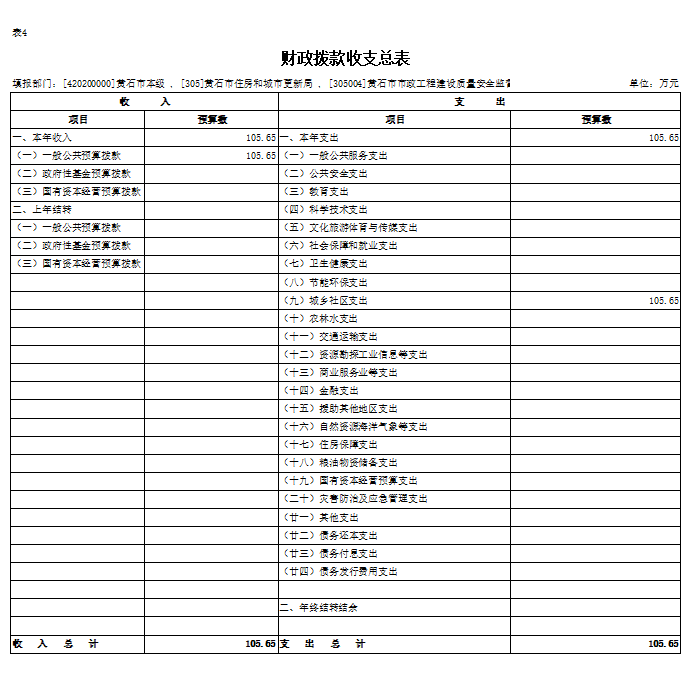 按照综合预算的原则,黄石市市政工程建设质量安全监督站所有收入和支出均纳入部门预算管理。收入包括:一般公共预算拨款收入。支出包括:城乡社区支出;2026年度收支总预算105.65万元。