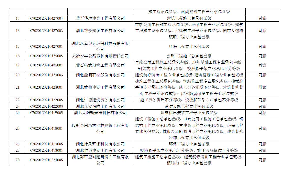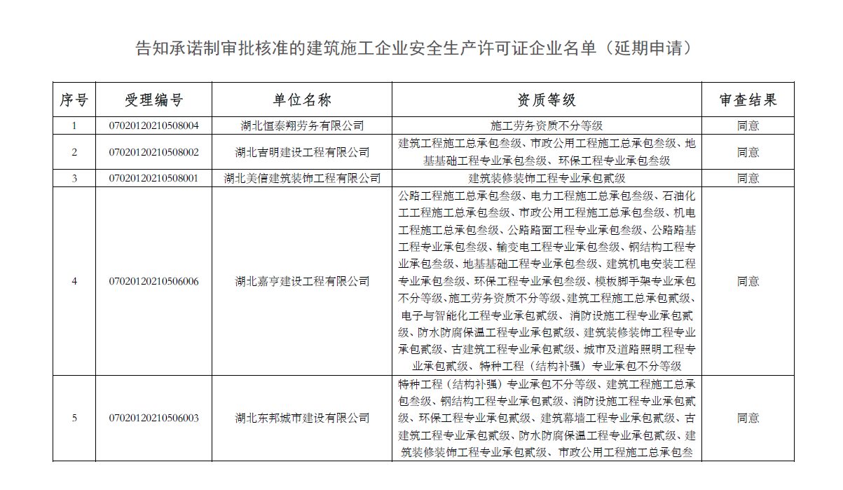 根据《安全生产许可证条例》(国务院令第397号)、《建筑施工企业安全生产许可管理规定》(建设部令第128号)及《湖北省住房和城乡建设领域“证照分离”改革全覆盖试点工作实施方案》,现将我局以告知承诺制审批方式核准的湖北恒泰翔劳务有限公司等28家建筑施工企业安全生产许可证延期事项企业名单予以公布。(见附件)。